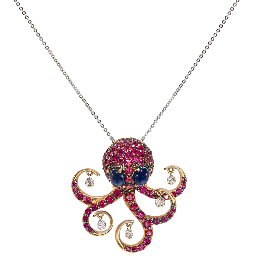 Хорошо узнаваемый яркий осьминожек Ponte Vecchio давно перерос из разряда «ювелирное украшение» в разряд «произведение ювелирного искусства», которое моментально подчеркивает безупречный вкус и особый статус своей обладательницы. Бриллиантовое колье с яркими сапфирами и рубинами, в котором виртуозно объединено белое и розовое золото, найдет свое место как в повседневном, так и вечернем и даже деловом образе. Такой аксессуар сделает наряд еще более уникальным и привнесет в него легкую нотку игривости.